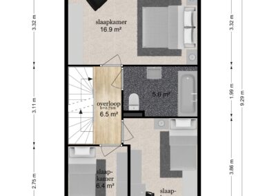 Vaste trap naar de ruime zolderverdieping met een brede dakkapel aan de achterzijde van het huis en voor dakramen, op deze verdieping vind je hier de overloop en toegang tot de 3 slaapkamers van 8,9 m², 8,7 m² en 4,1 m². Verder is er een bergvliering en ruimte voor cv-installatie (2022) en de witgoedaansluitingen,