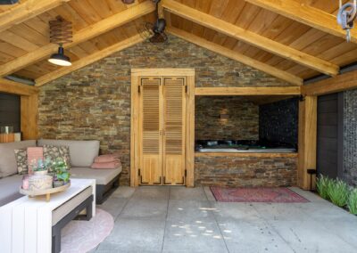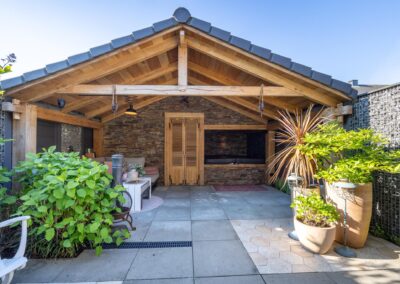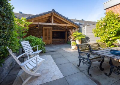 –	Achtertuin met bijgebouw en overkapping van 2020.