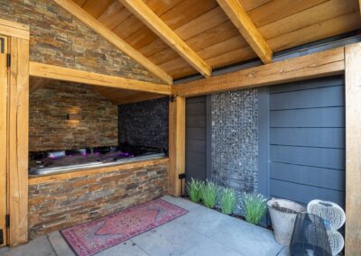 De heerlijk zonnige tuin is gunstig gelegen op het zuiden en grotendeels bestraat. Een elektrisch bedienbaar zonnescherm biedt schaduw op het terras bij huis. Achterin de tuin is er een fraaie chalet met veranda geplaatst van massief Eikenhout, voorzien van een whirlpool geschikt voor 5 personen! Er is een goede berging in het chalet, alsmede een kleine vliering onder de kap. Via de berging is een achterom bereikbaar.