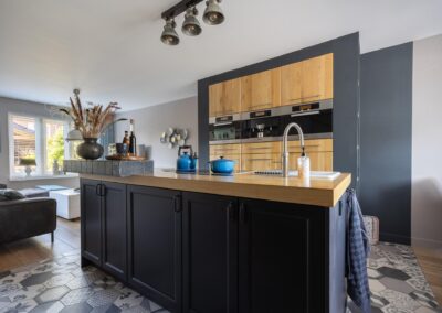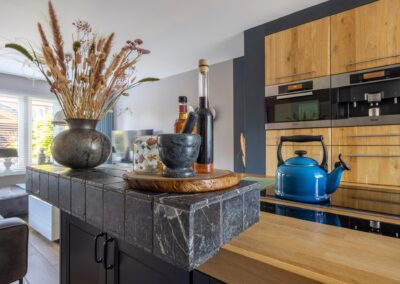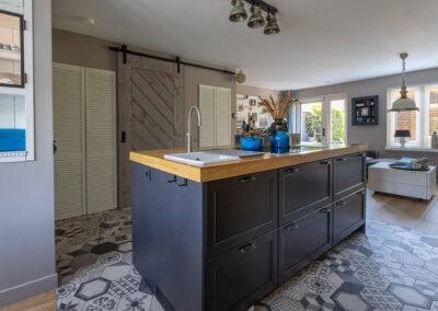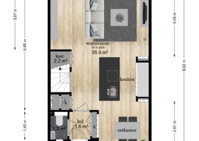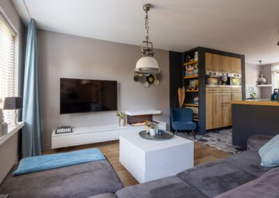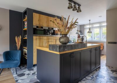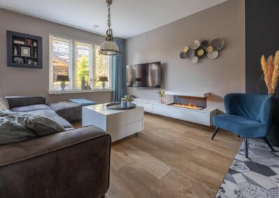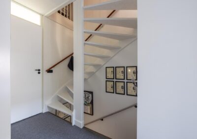 Begane grond: ENTREE, hal, modern toilet met hangend closet en fontein. Vanuit de hal is er toegang naar de woonkamer met ruim opgestelde moderne keuken. De open woonkeuken is aan de voorzijde van het huis gesitueerd met mogelijkheid voor eethoek. De ruimte is voorzien van prachtige Portugese plavuis en handige kastruimtes. De inbouwkeuken met een kastenwand en een kookeiland, is ingericht met koelkast, 4 laden-vrieskast, combimagnetron, stoomoven, inbouw koffiezetapparaat, vaatwasser, keramische kookplaat en recirculatie/afzuiging in het aanrechtblad. Meterkast is gesitueerd in de woonkamer en keurig weggewerkt achter 2 louvre deurtjes. De trap heeft een multifunctionele trapkast en slimme lades in de traptreden. De trap is middels een loftdeur af te sluiten. Aan de tuinzijde is het zitgedeelte gesitueerd met een plavuizen houtlook, wandmeubel en raampartij en loopdeur naar de tuin.