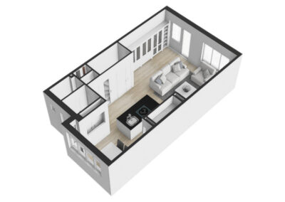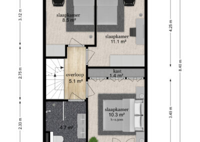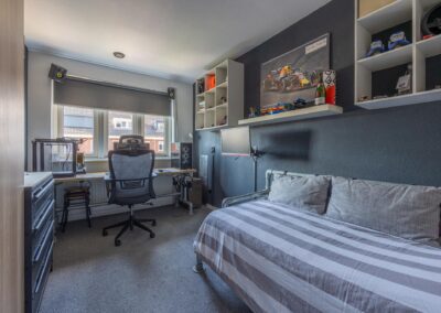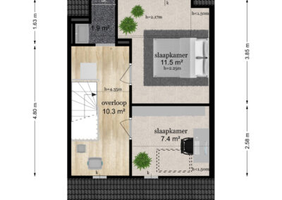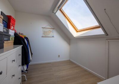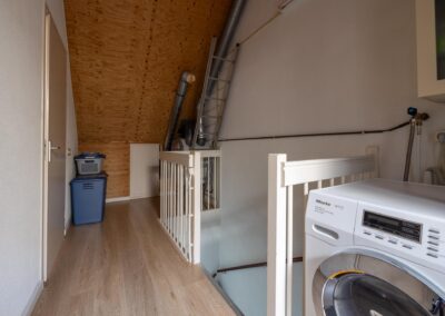 2e Verdieping: overloop met WTW Unit en aansluiting voor de wasmachine. Aan de voorzijde een kleine slaap-/werkkamer met dakraam. Aan de achterzijde een ruime 5e slaapkamer met brede dakkapel en een 2e badkamer voorzien van inloopdouche en waskom. Vanuit de overloop toegang naar bergruimte boven de slaapkamers.