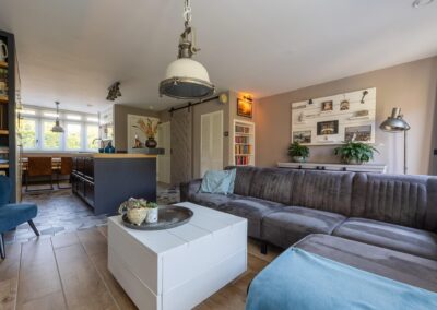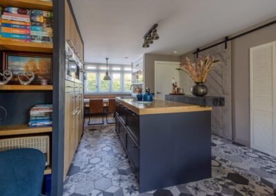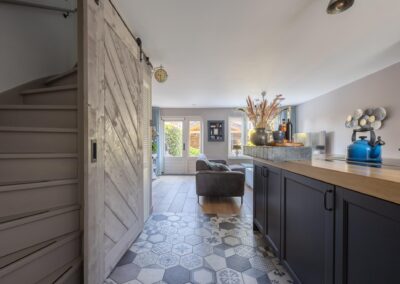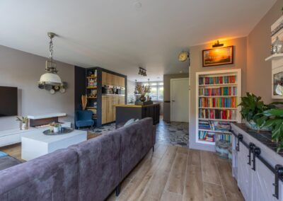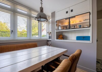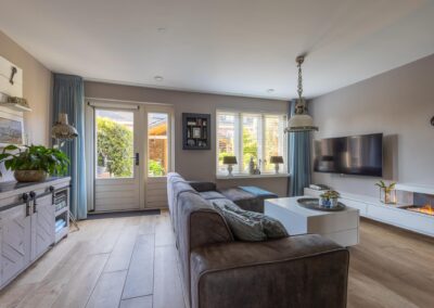 Begane grond: ENTREE, hal, modern toilet met hangend closet en fontein. Vanuit de hal is er toegang naar de woonkamer met ruim opgestelde moderne keuken. De open woonkeuken is aan de voorzijde van het huis gesitueerd met mogelijkheid voor eethoek. De ruimte is voorzien van prachtige Portugese plavuis en handige kastruimtes. De inbouwkeuken met een kastenwand en een kookeiland, is ingericht met koelkast, 4 laden-vrieskast, combimagnetron, stoomoven, inbouw koffiezetapparaat, vaatwasser, keramische kookplaat en recirculatie/afzuiging in het aanrechtblad. Meterkast is gesitueerd in de woonkamer en keurig weggewerkt achter 2 louvre deurtjes. De trap heeft een multifunctionele trapkast en slimme lades in de traptreden. De trap is middels een loftdeur af te sluiten. Aan de tuinzijde is het zitgedeelte gesitueerd met een plavuizen houtlook, wandmeubel en raampartij en loopdeur naar de tuin.