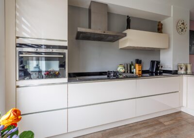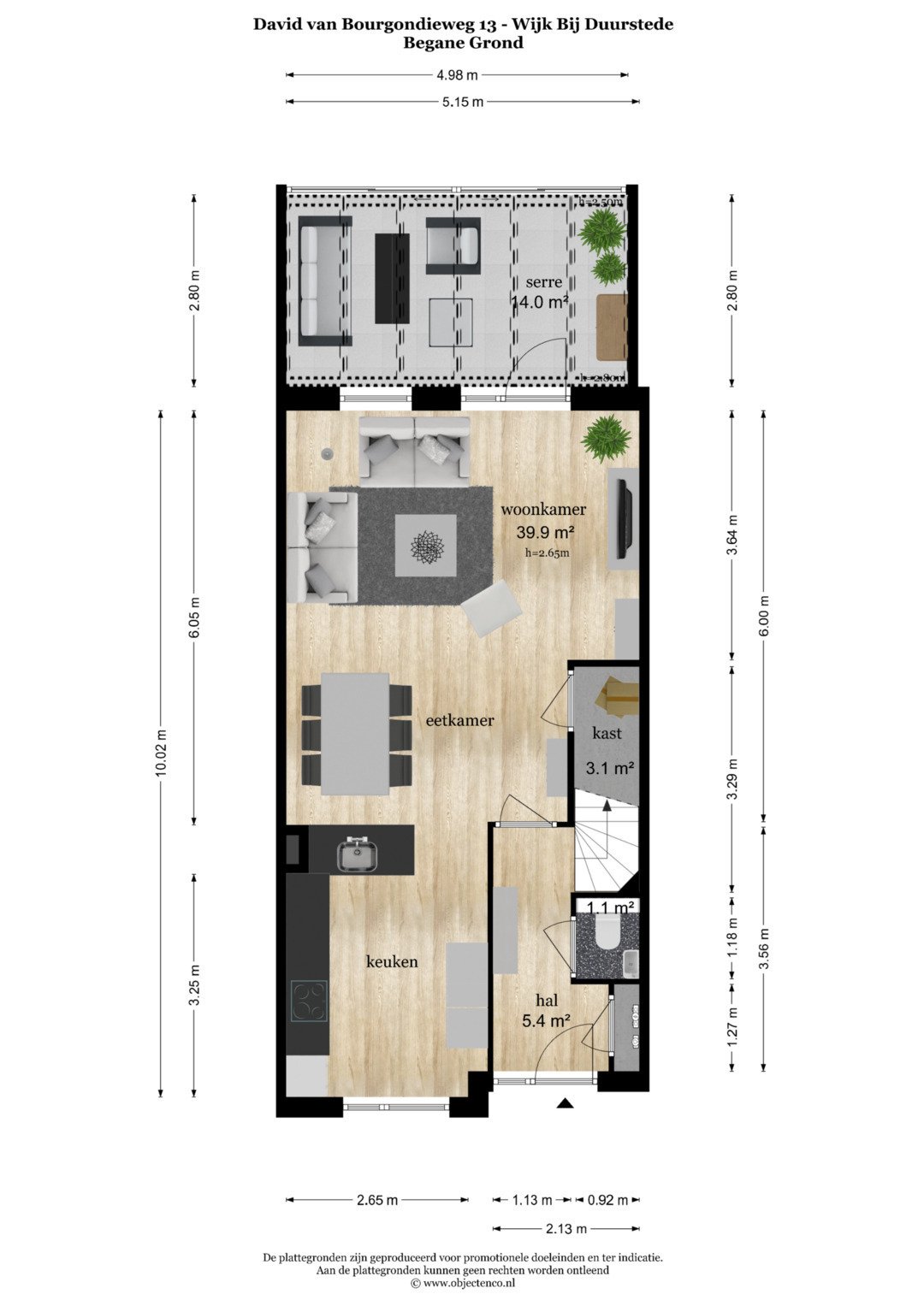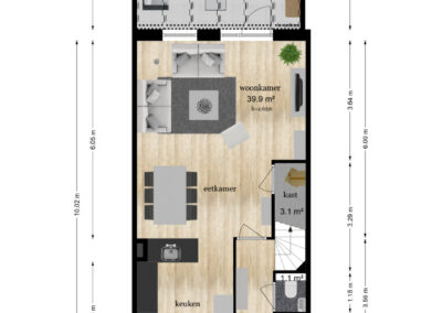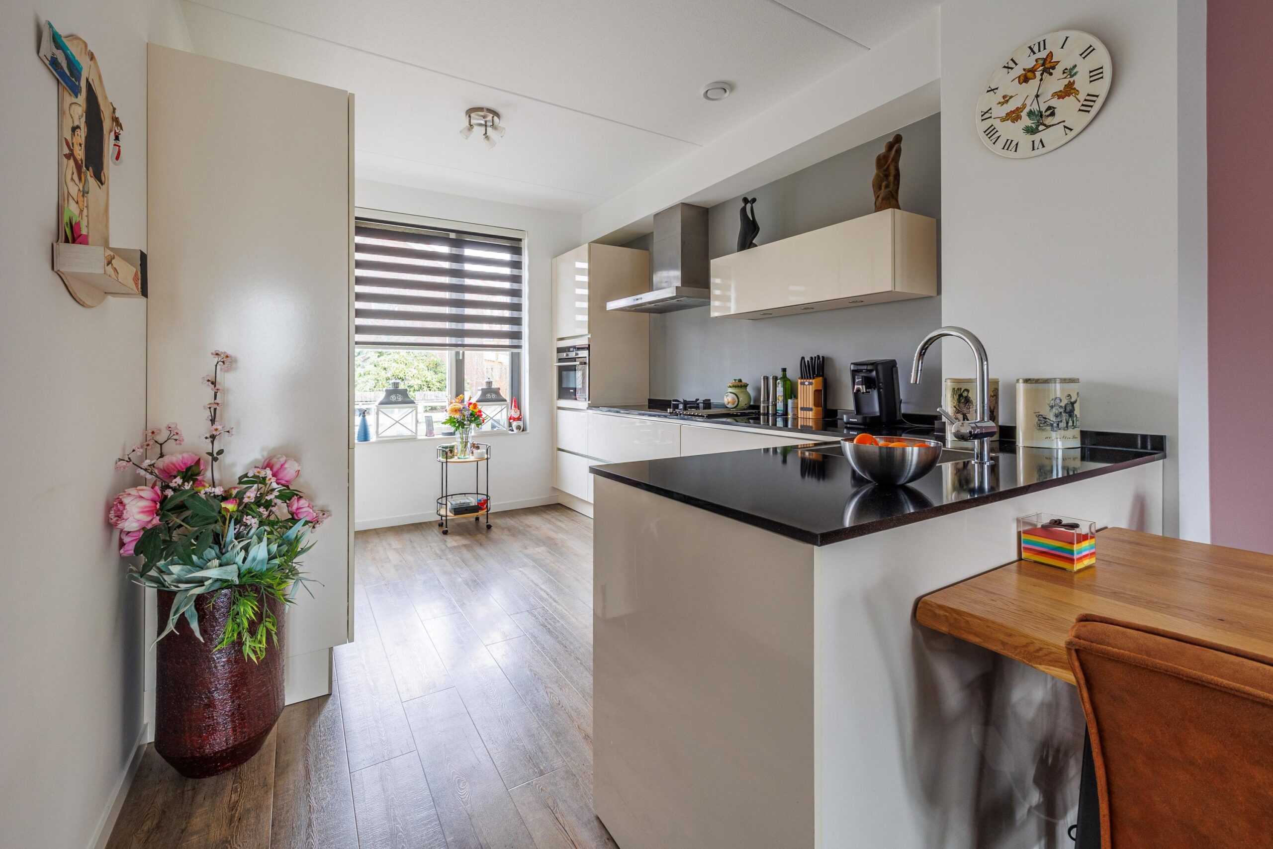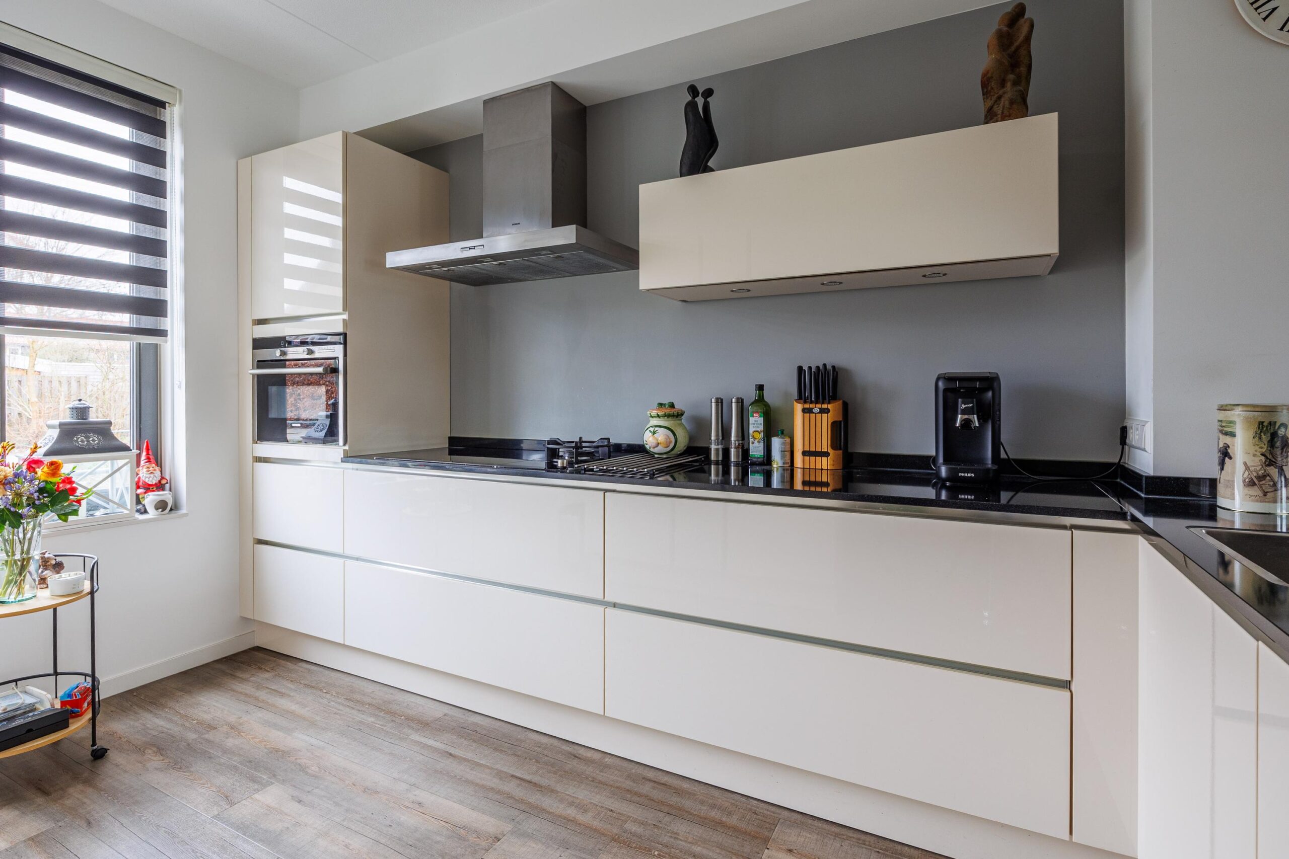 ENTREE, hal met meterkast en toiletruimte. De royale, tuingerichte woonkamer van 39.9 m² is aan de achterzijde van de woning gelegen en beschikt over een praktische vaste kast onder de trap en een deur naar de serre. Aan de voorzijde bevindt zich de open keuken, compleet uitgerust met een inductiekookplaat met wokbrander, afzuigkap, koelkast, vriezer, combimagnetron en vaatwasser. De volledige begane grond is bovendien voorzien van comfortabele vloerverwarming.