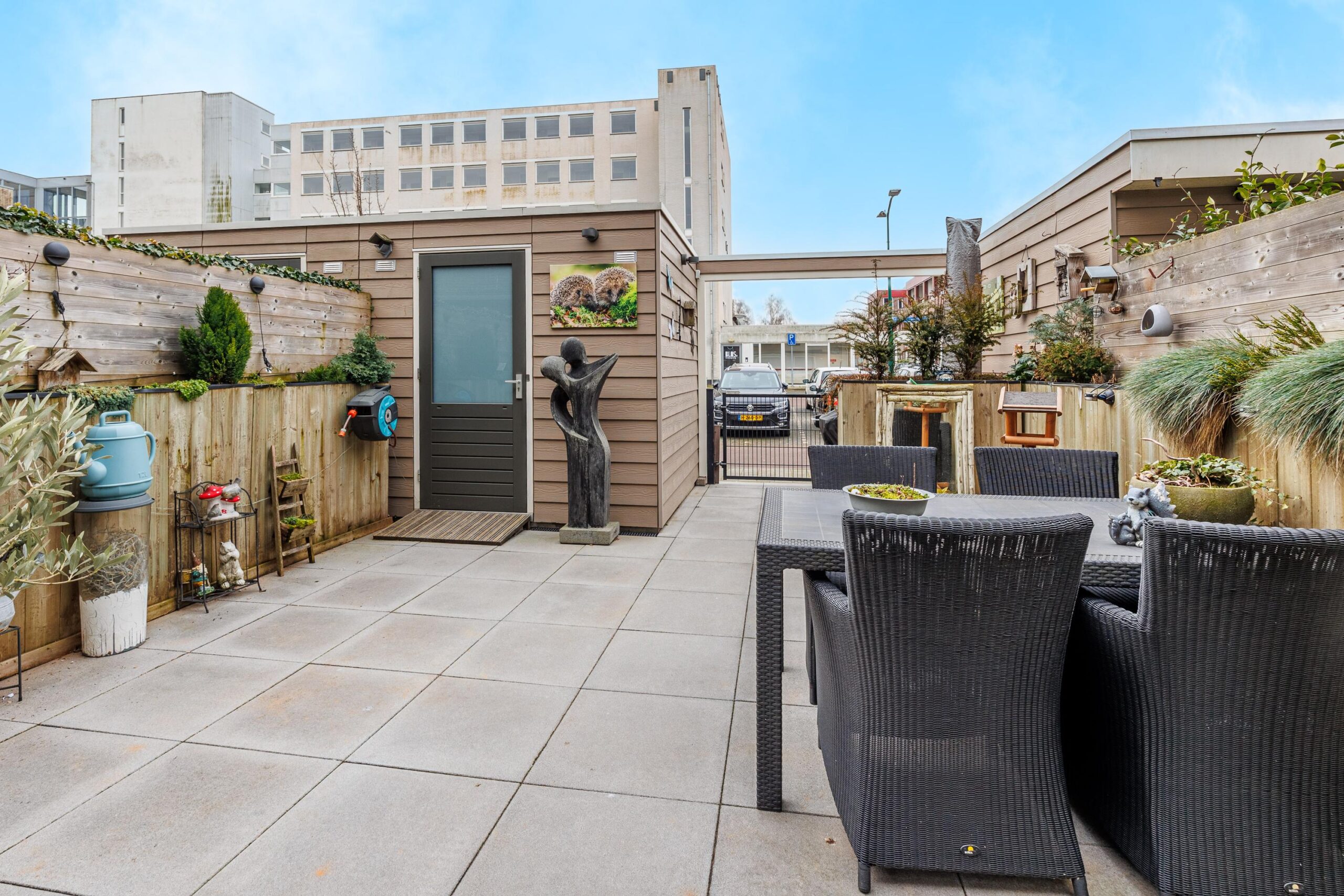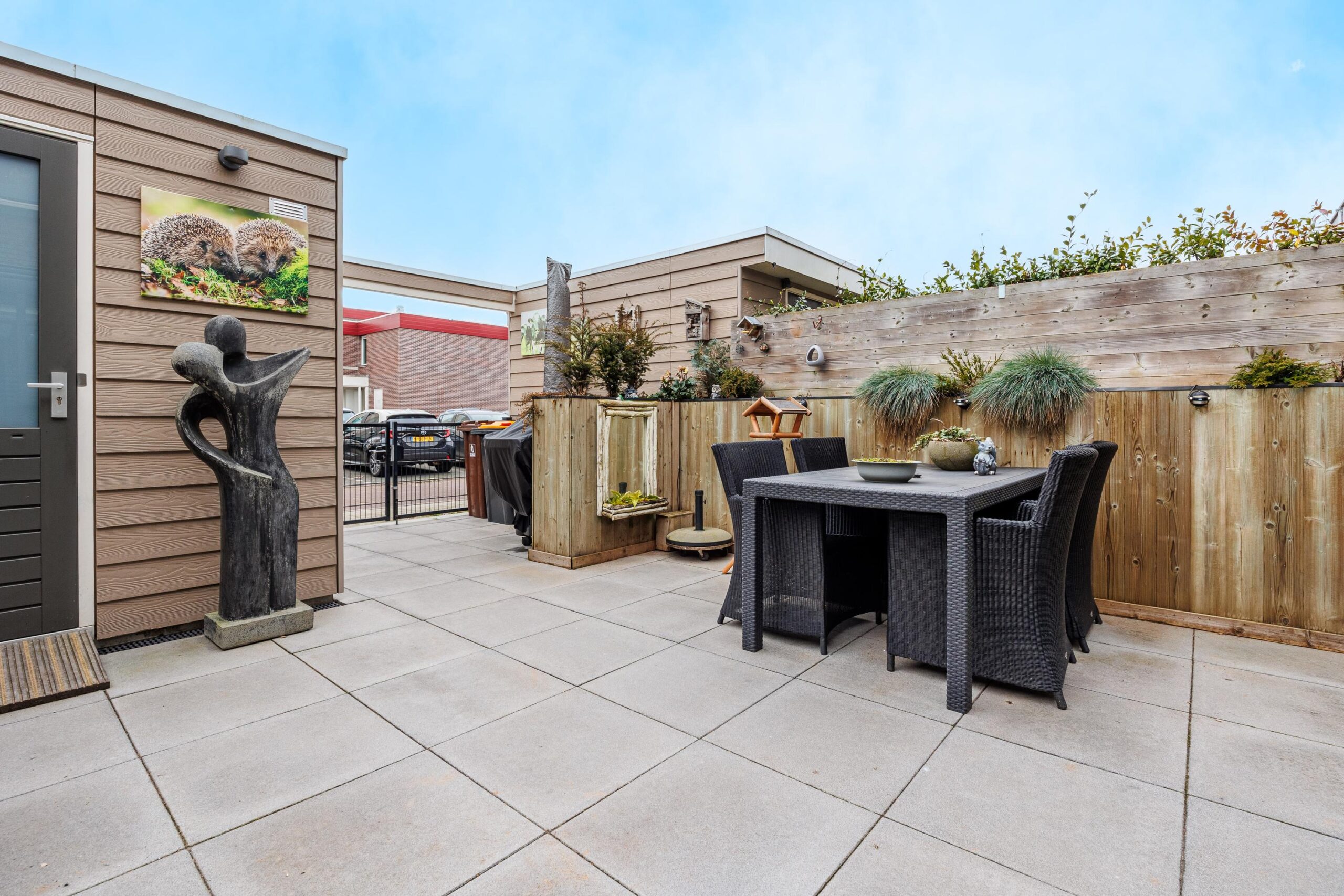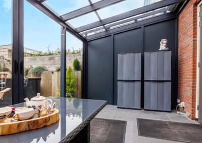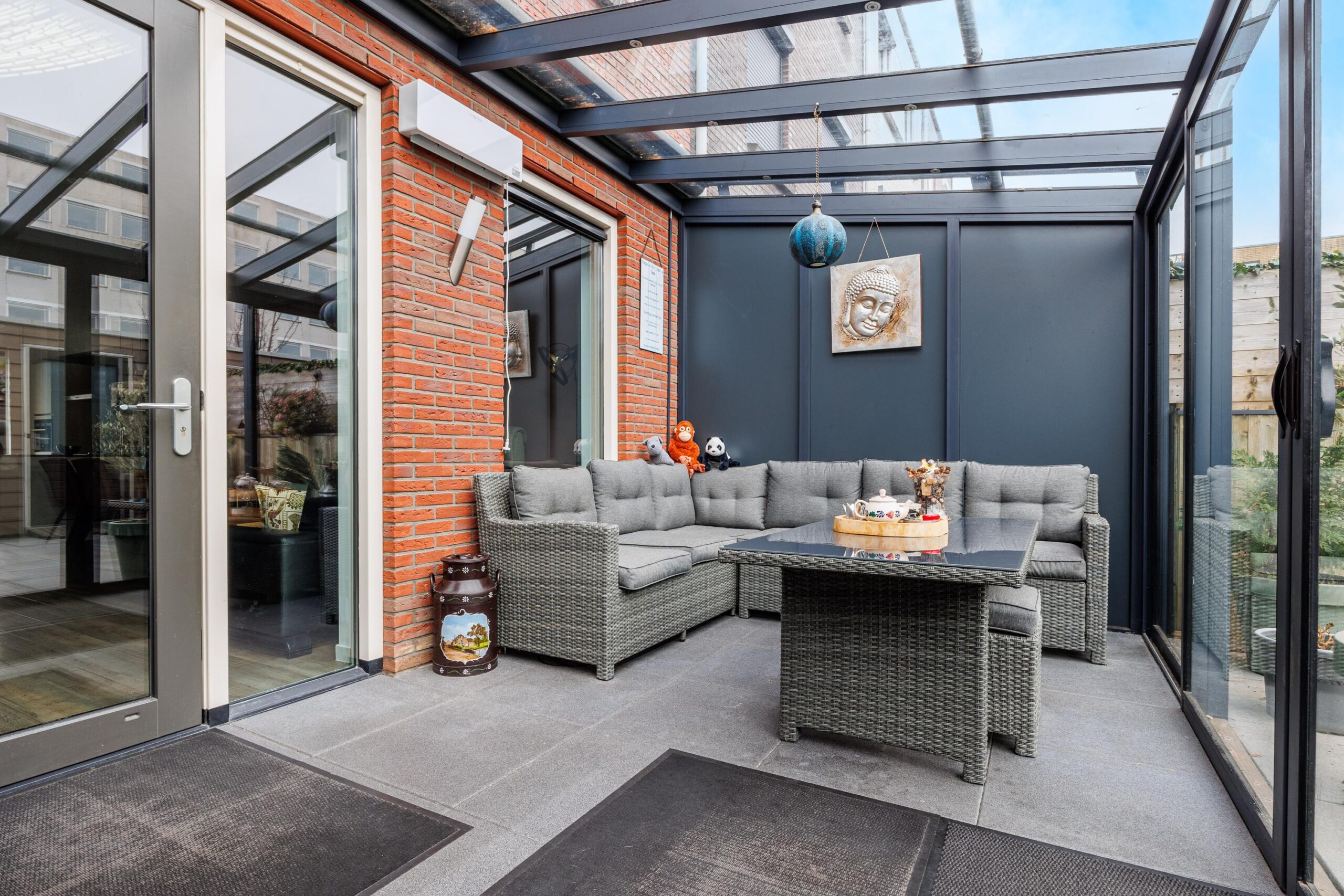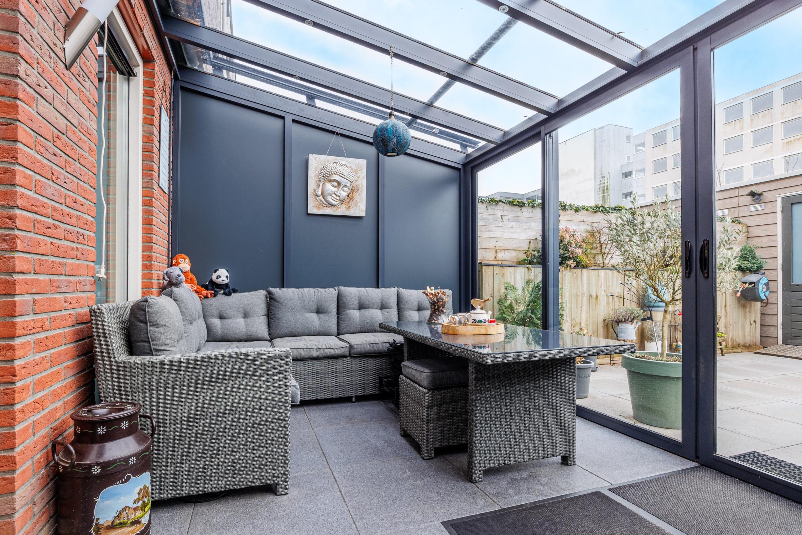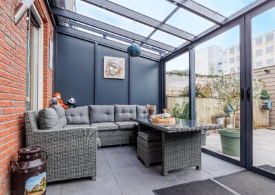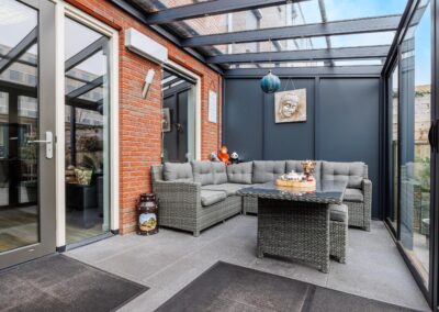 De zonnige achtertuin, gelegen op het zuiden, is ingericht met een serre, berging met elektra en een achterom. De aluminium serre is voorzien van een zonnescherm, spotjes en een elektrische kachel.