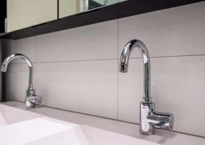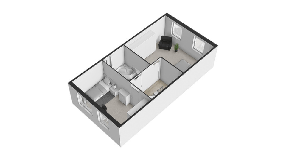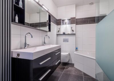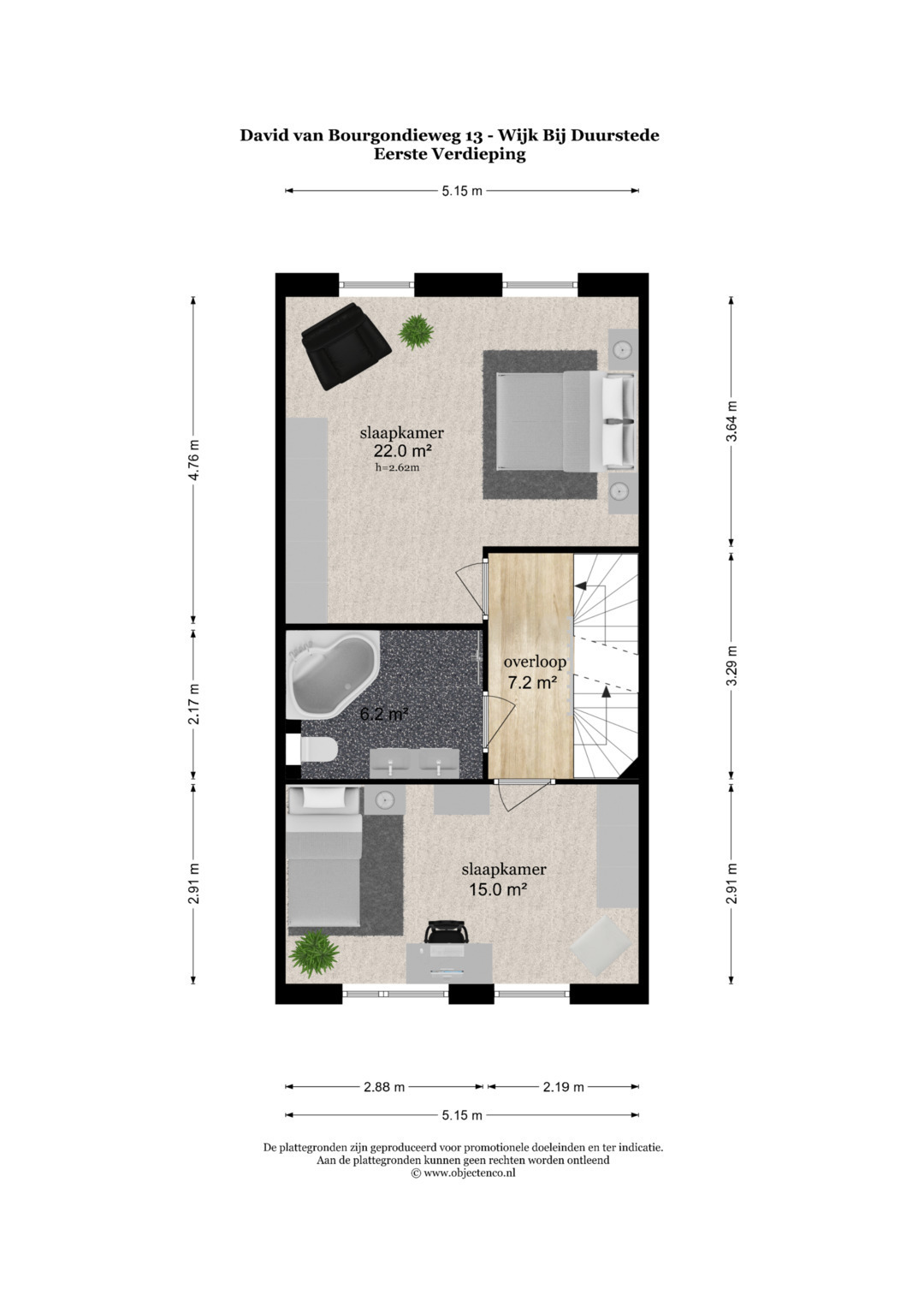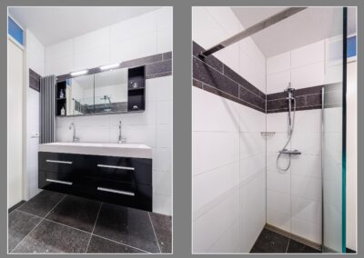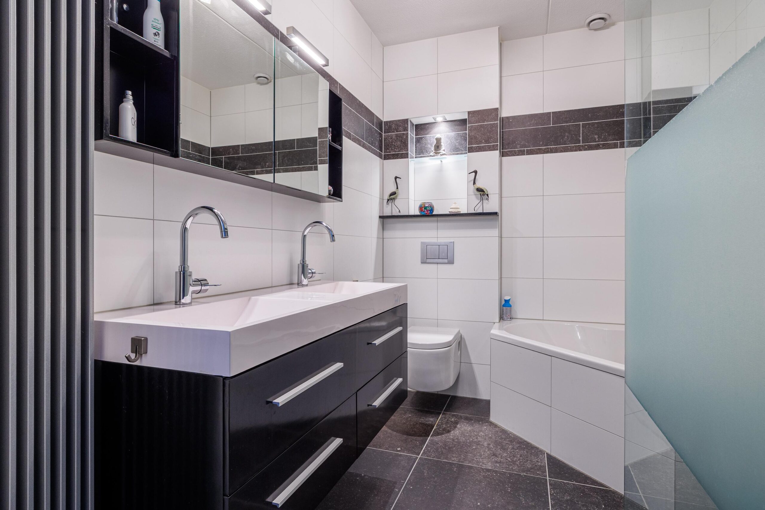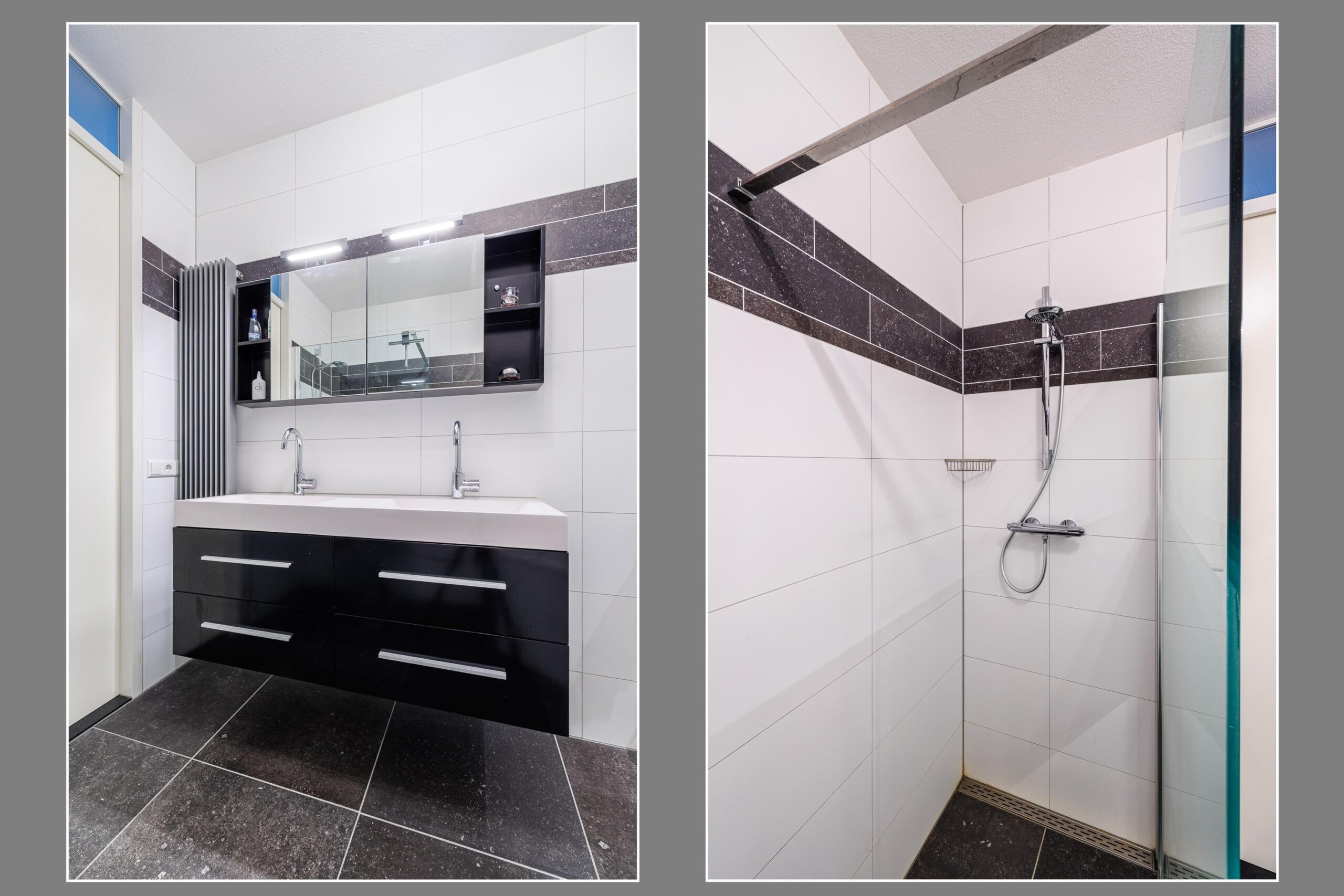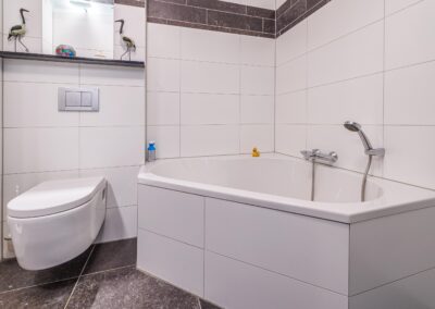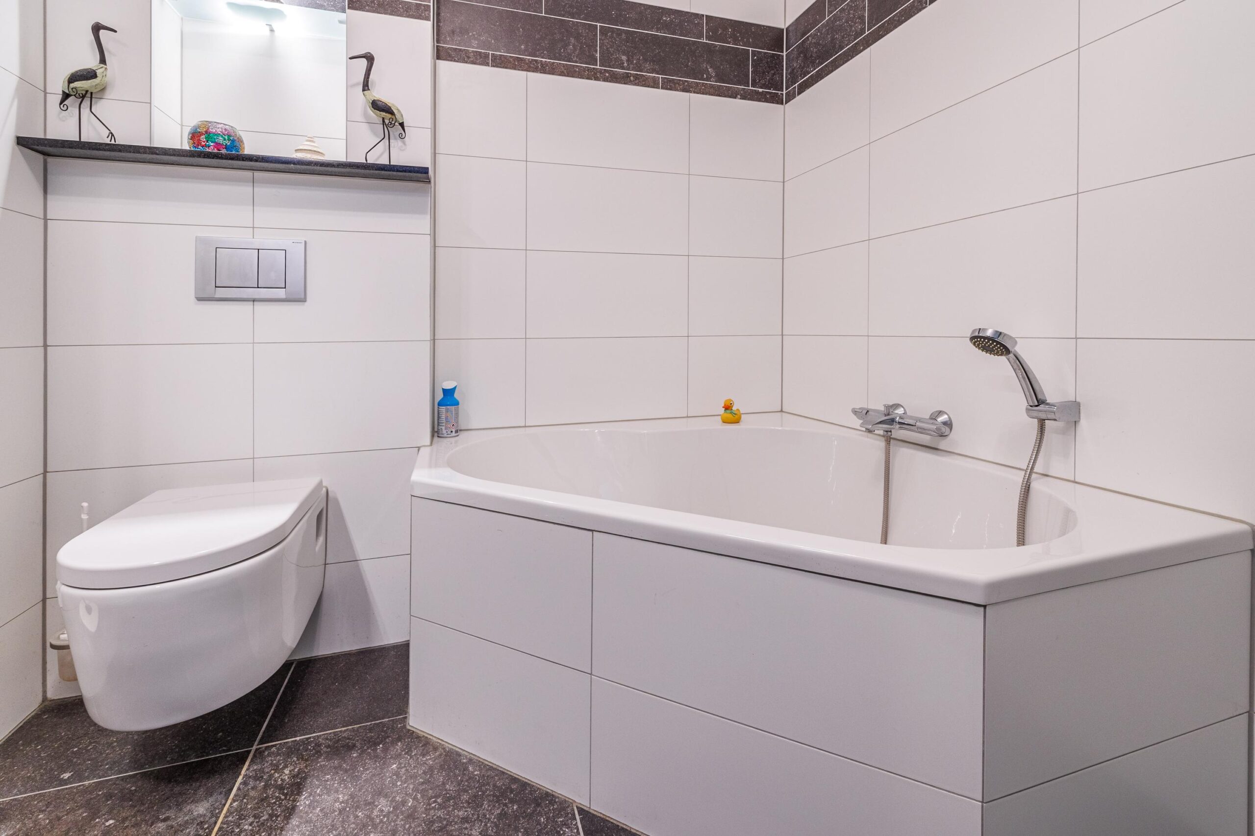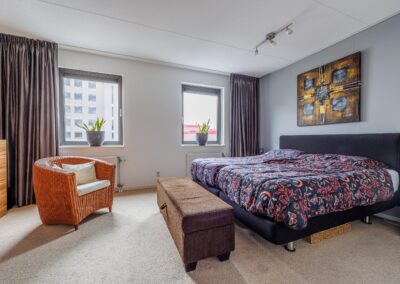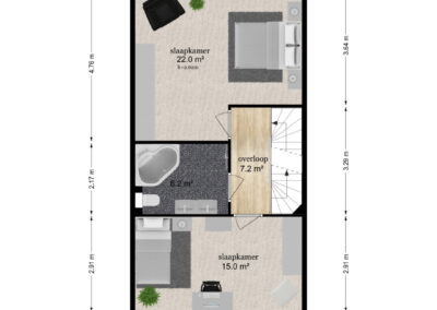 Overloop met toegang tot twee slaapkamers die zich over de volledige breedte van de woning uitstrekken. Aan de voorzijde bevindt zich een ruime slaapkamer van 15 m², terwijl aan de achterzijde de royale master bedroom van 22 m² is gesitueerd, voorzien van screens en volop leefruimte. De volledig betegelde badkamer is compleet uitgevoerd met een inloopdouche, ligbad, dubbele wastafel, toilet en comfortabele vloerverwarming.
