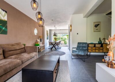 Bij binnenkomst wordt u verwelkomd tot de lichte woonkamer. De woonkamer is voorzien van grote raampartijen die zorgen voor veel natuurlijk lichtinval en een gezellige sfeer. De tuin is toegankelijk via de schuifpui, waardoor deze een verlengstuk van de woonkamer vormt. De half open keuken is modern ingericht en van alle gemakken voorzien. Daarnaast beschikt de woning over een bijkeuken met ruimte voor een grote (voorraad)kast en tevens is hier toegang tot de achtertuin.