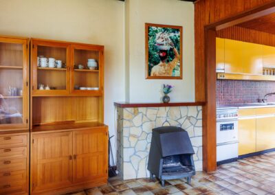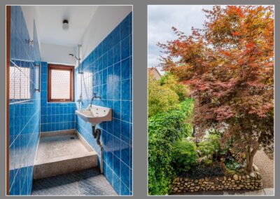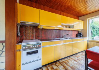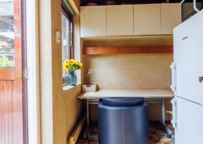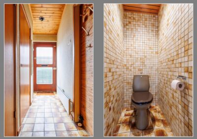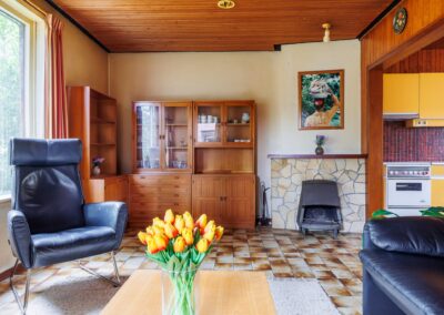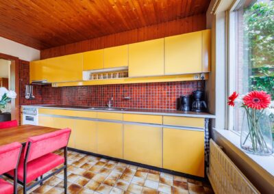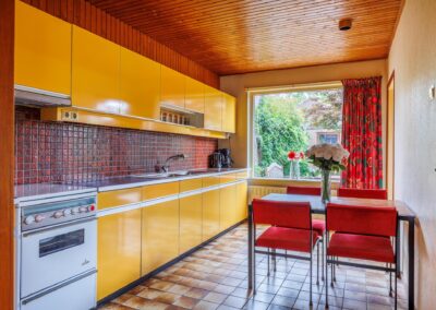 ENTREE, hal met trapkelder/meterkast, trapopgang en toiletruimte. De sfeervolle woonkamer met grote raampartij ligt aan de voorzijde van het huis en biedt vrij uitzicht op de voortuin en de groene omgeving. De woonkeuken aan de achterzijde is voorzien van eenvoudige (retro) keukenblok uit 1960 en zicht op de achtertuin. Aangrenzend bevindt zich de praktische bijkeuken met witgoedaansluitingen. Vanuit de bijkeuken loop je zo de diepe achtertuin in met fijn terras zowel in de zon als in de schaduw en meerder soorten heesters en groen. De achtertuin is 108 m² groot, en voorzien van een achterom, vrijstaande garage, carport, extra stenen berging en een lange oprit naast het huis voor meerdere auto’s op eigen terrein.