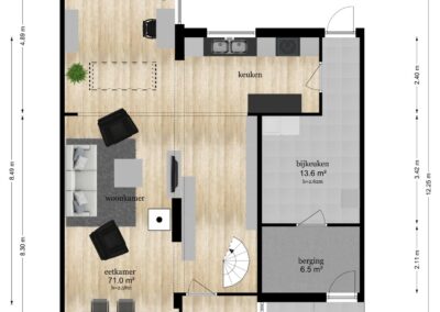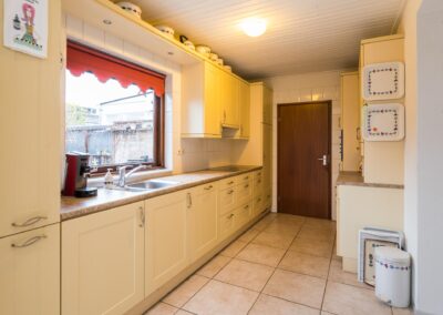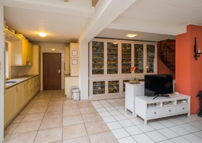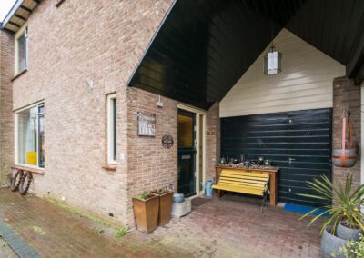 ENTREE onder de overkapping, ontvangsthal met toiletruimte, meterkast en garderobekast, toegang tot de zeer ruime living met eetgedeelte aan de voorzijde van het huis, uitbouw aan de achterzijde heeft een lichtstraat in het plafond en een schuifpui naar de achtertuin, centraal in de living is ruimte voor een sfeervolle kachel, aan de achterzijde van de woning is de open keuken met diverse inbouwapparatuur waaronder een kookplaat, afzuigkap, combi-oven, koelkast en vaatwasser. De woonkamer, eethoek en keuken zijn samen maar liefst 71 m². Voorts een praktische bijkeuken van 13,6 m² met aansluiting voor witgoedapparatuur, deze bijkeuken heeft een deur naar de inpandige bering in de voorzijde van het huis en een deur naar de achtertuin.