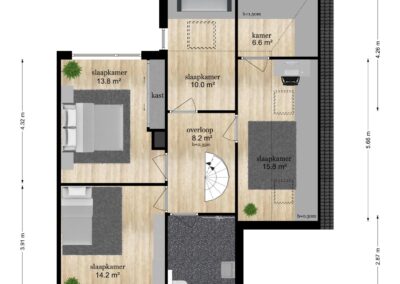Overloop met toegang tot de 4 slaapkamers van 14,2 m², 13,8 m², 10 m² en 6,6 m² waarvan er één is voorzien van een vaste schuifwandkast en één van een bergruimte. De badkamer is ingericht met een 2e toilet, inloopdouche en vaste wastafel.