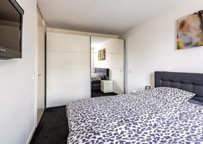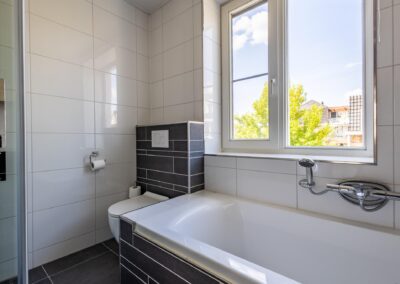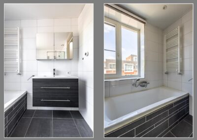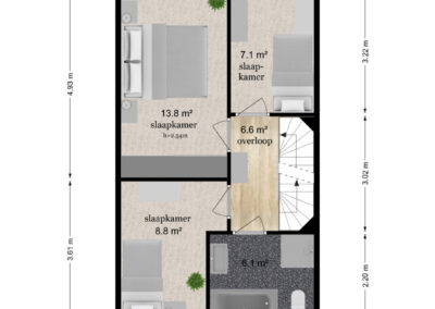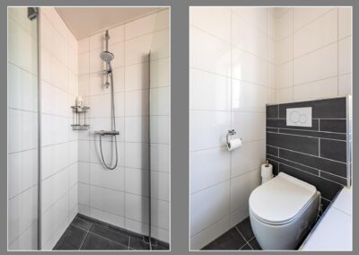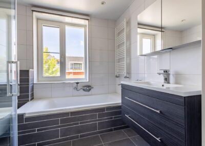 Overloop met toegang naar 3 ruime slaapkamers van 13,8 m², 8,8 m² en 7,1 m². Alle slaapkamers zijn voorzien van rolluiken! De moderne en betegelde badkamer van 6,1 m² is ingericht met ligbad, inloopdouche, 2e toilet (zwevend) wastafelmeubel, designradiator en vloerverwarming.