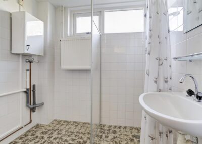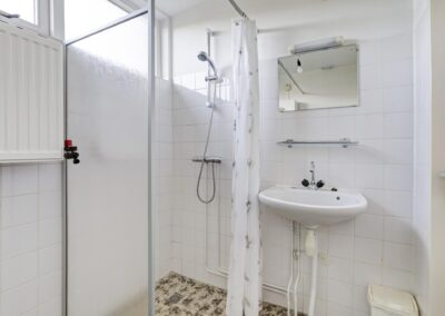 Overloop met toegang naar 3 slaapkamers van 13,3, 8,2 en 7,3 m². De badkamer is ingericht met een douche, wasmachine-aansluiting en wastafel.