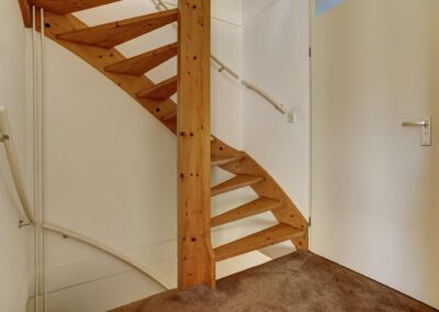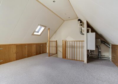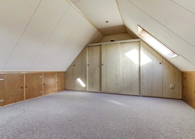 Vaste trap naar een royale slaap-zolderverdieping van 15,4 m² ! Een fraai afgetimmerde verdieping met inbouwspots, vaste kastenwand en 2 dakramen. Naast de trap de opstelling voor cv en mv-installatie. Er is op deze verdieping eenvoudig een 4e slaapkamer te realiseren.