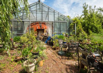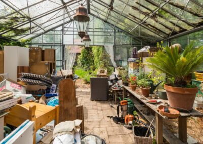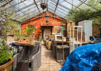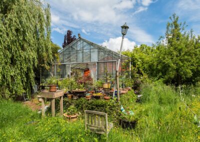 Achter het huis bevindt zich een verwarmde, royale orangerie (kas) van 64 m² en een terras van 32 m² in mediterrane sfeer. De orangerie en berging zijn samen circa 89 m² groot. Electra, water en gasaansluiting zijn aanwezig.