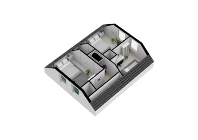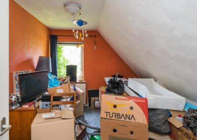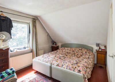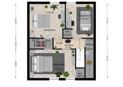 Overloop met toegang tot 1 ruime slaapkamer van 14,4 m² aan de voorzijde van woning en 2 slaapkamers van 13 m² en 9,7 m² aan de achterzijde van de woning. Tussen de grote slaapkamer en de hieraan grenzende achterste slaapkamer bevind zich een doorloopkast. Tevens is er een separate berging van 3,5 m².