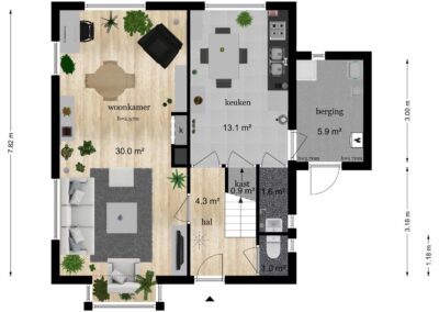 ENTREE, hal met toilet en trapopgang. De ruime en lichte woonkamer van 30 m² heeft een erker aan de voorzijde van de woning. De dichte woonkeuken van 13,1 m² is voorzien van apparatuur. Vanuit de keuken is er toegang tot trapkast, douche en inpandige berging met opstelplaats voor cv-ketel en wasmachine-aansluiting.