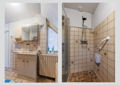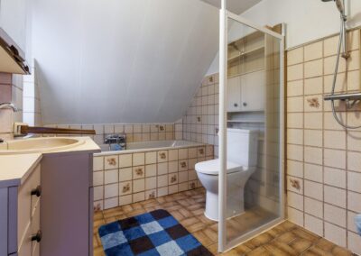 Overloop met toegang tot 3 slaapkamers, badkamer uitgerust met een wastafel, douche, toilet en ligbad.