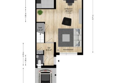 ENTREE, hal, toegang tot de woonkamer en eenvoudige half open keuken. De ruime doorzonwoonkamer beschikt over veel licht. Op de begane grond bevindt zich ook een separaat toiletruimte en bergingsruimte.