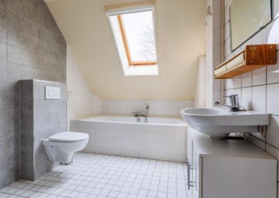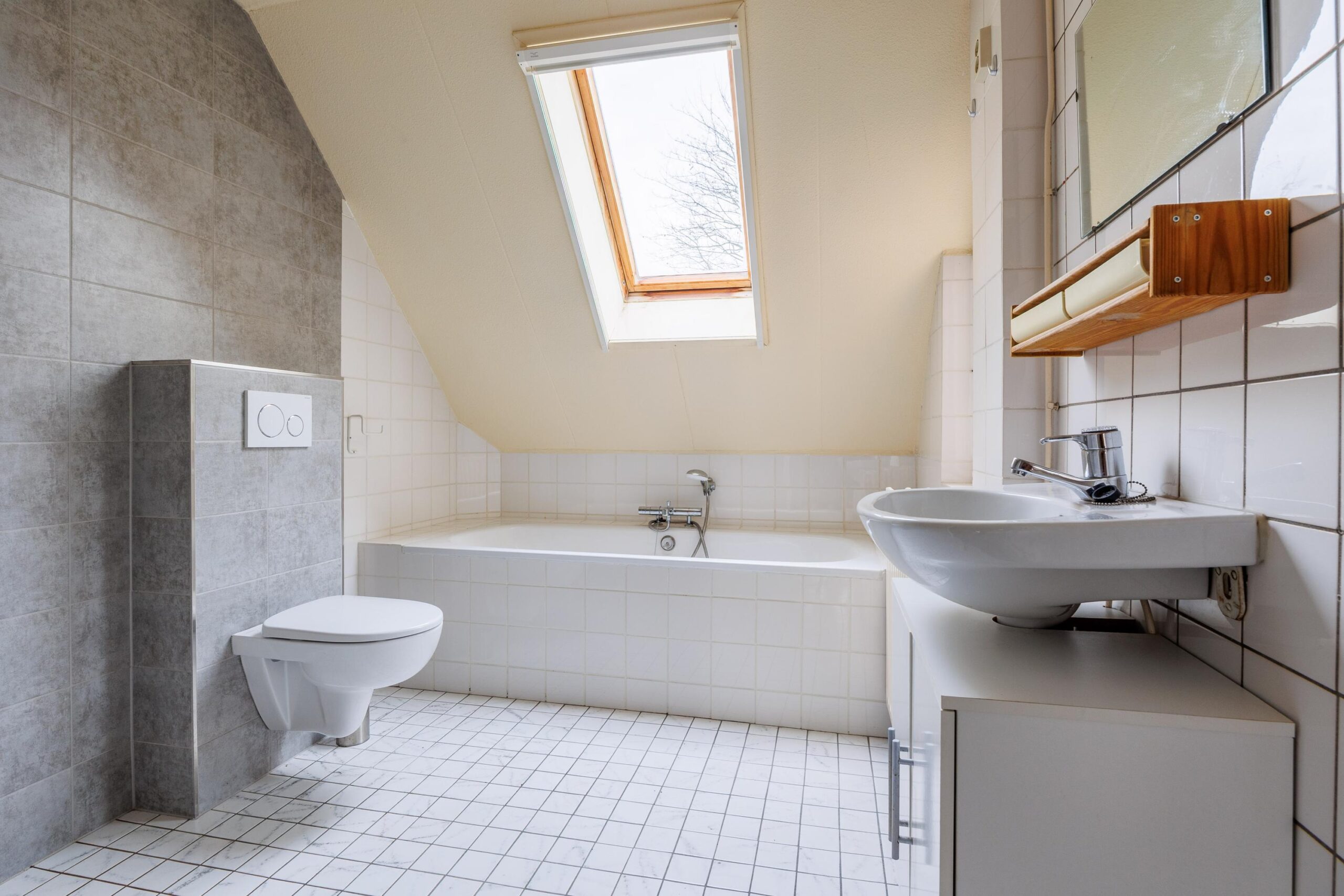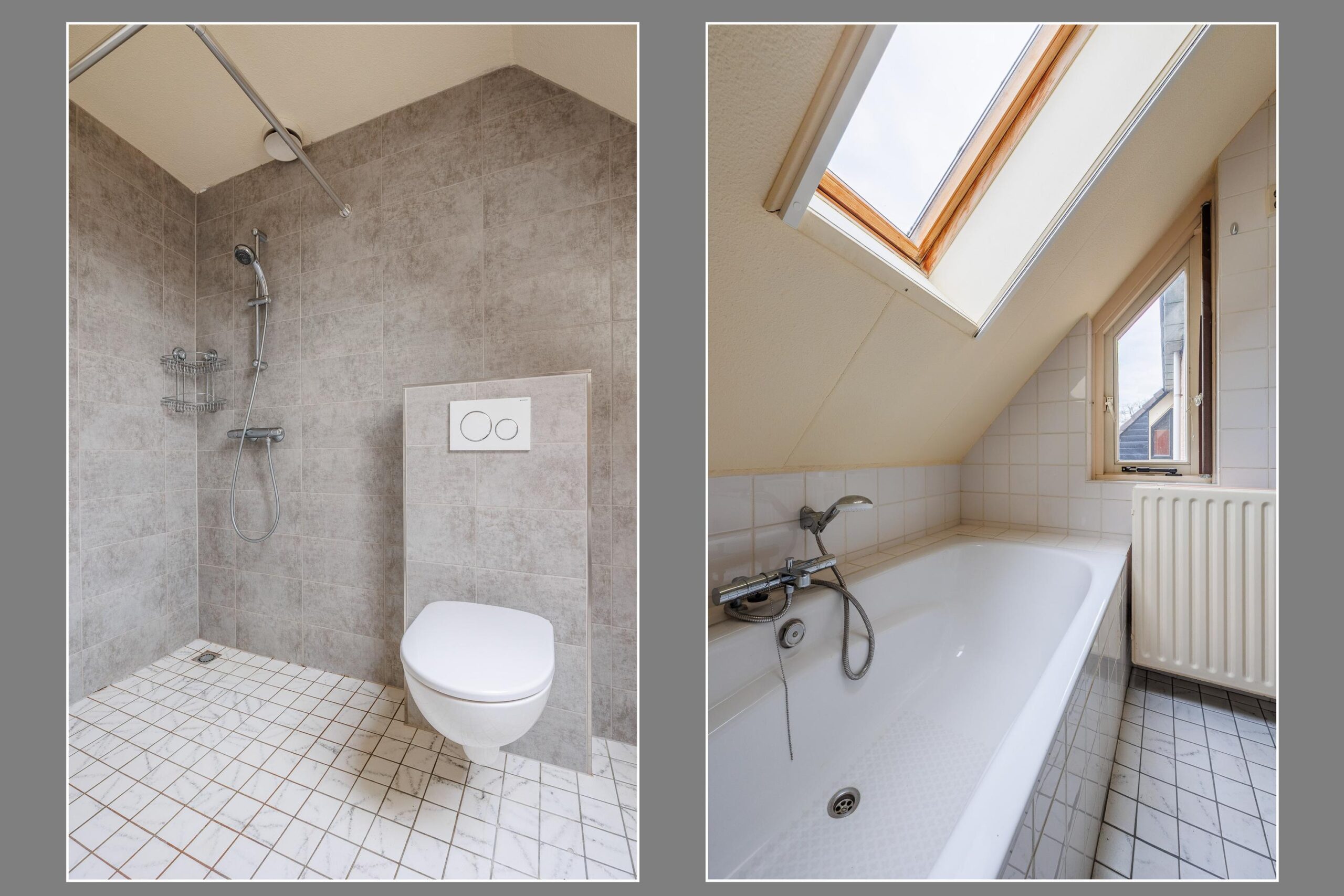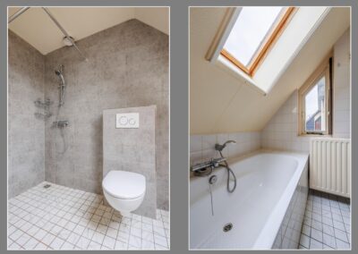 Overloop met toegang tot 3 ruime en lichte slaapkamers door de dakkapel en dakramen, badkamer uitgerust met een wastafel, douche, toilet en ligbad.