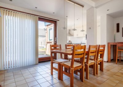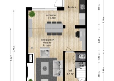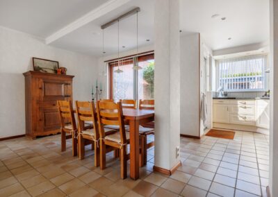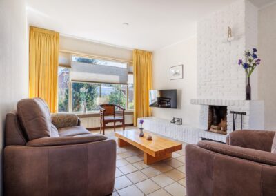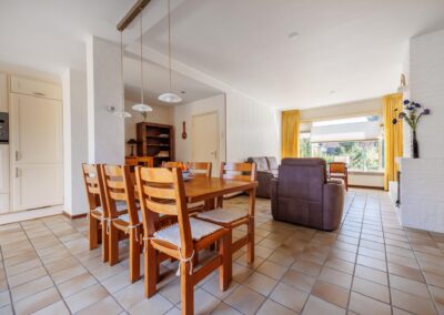 Bij binnenkomst wordt u verwelkomd in een lichte en sfeervolle uitgebouwde woonkamer. Dankzij de schuifpui naar de achtertuin haalt u het buitenleven naar binnen en geniet u optimaal van het natuurlijke daglicht. Deze prettige leefruimte biedt plaats aan zowel een comfortabele zithoek als een gezellige eethoek.