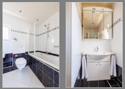 Eerste verdieping: Overloop met toegang tot 3 slaapkamers en de badkamer met wastafelmeubel, toilet, ligbad met douche.