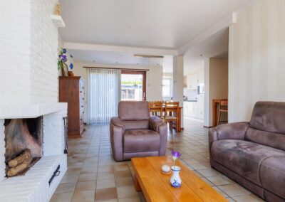 Bij binnenkomst wordt u verwelkomd in een lichte en sfeervolle uitgebouwde woonkamer. Dankzij de schuifpui naar de achtertuin haalt u het buitenleven naar binnen en geniet u optimaal van het natuurlijke daglicht. Deze prettige leefruimte biedt plaats aan zowel een comfortabele zithoek als een gezellige eethoek.