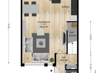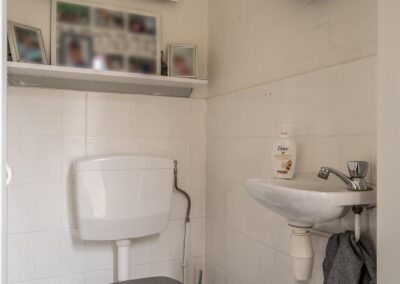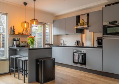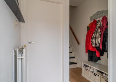 ENTREE, hal met toiletruimte, meterkast en trapopgang. Toegang tot de fraaie, lichte woonkamer met stoere, brede eikenplankenlaminaat en grote raampartij. De open keuken is voorzien van een inductie kookplaat, afzuigkap, koelkast, vriezer, vaatwasser, kokend waterkraan en een close-in-boiler. De keuken en woonkamer zijn samen 34,8 m² groot. Vanuit de keuken is er een deur naar de achtertuin.
