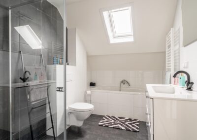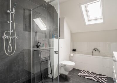 Overloop met toegang tot 3 slaapkamers van 14,3 m², 10,1 m² en 7,1 m². De volledig vernieuwde badkamer is voorzien van een inloopdouche, stort/regendouche en drain, groot ligbad, 2e toilet en een Velux dakraam.