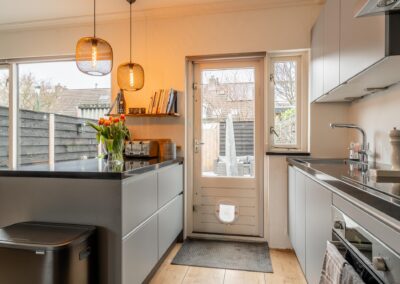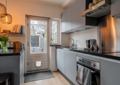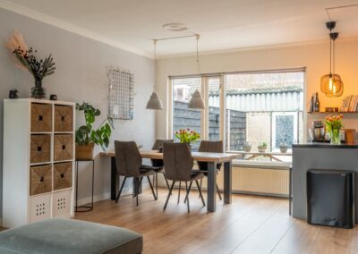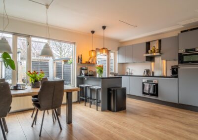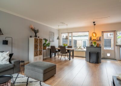 ENTREE, hal met toiletruimte, meterkast en trapopgang. Toegang tot de fraaie, lichte woonkamer met stoere, brede eikenplankenlaminaat en grote raampartij. De open keuken is voorzien van een inductie kookplaat, afzuigkap, koelkast, vriezer, vaatwasser, kokend waterkraan en een close-in-boiler. De keuken en woonkamer zijn samen 34,8 m² groot. Vanuit de keuken is er een deur naar de achtertuin.