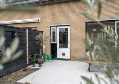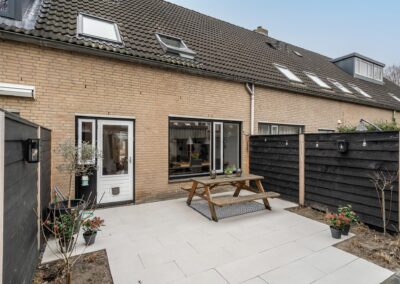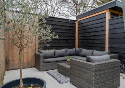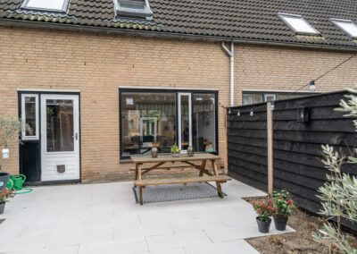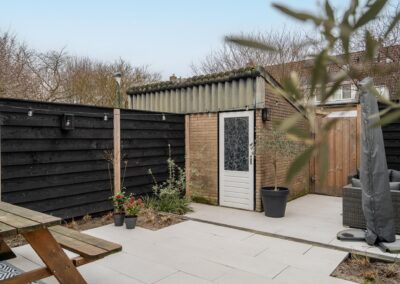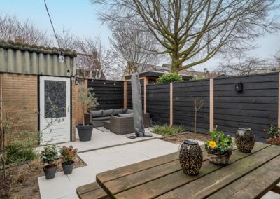– Achtertuin met gepotdekselde schuttingen en fraaie bestrating van 2022.
