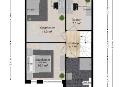 Overloop met toegang tot 3 slaapkamers van 14,3 m², 10,1 m² en 7,1 m². De volledig vernieuwde badkamer is voorzien van een inloopdouche, stort/regendouche en drain, groot ligbad, 2e toilet en een Velux dakraam.
