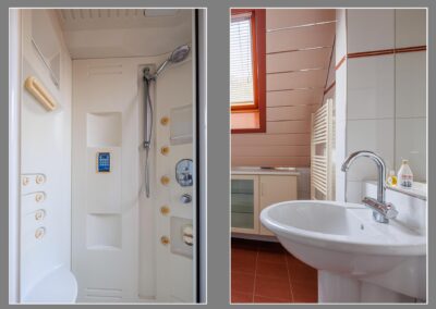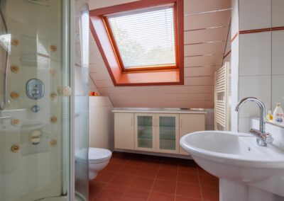 Overloop met toegang tot 3 slaapkamers, badkamer uitgerust met een wastafel, douche, toilet, designradiator.