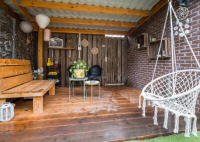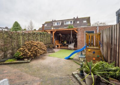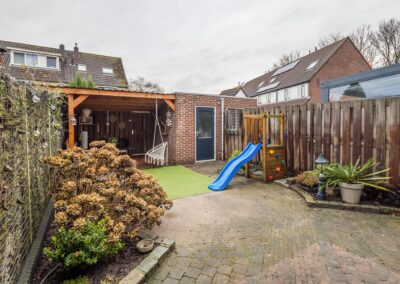 De achtertuin, gelegen op het westen, is ingericht met een heerlijk terras, groene borders, sfeervolle kokosschutting, gezellige overkapping, stenen berging en een achterom.