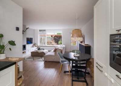 ENTREE, hal met toiletruimte, meterkast en trapopgang. Toegang tot de warme en lichte woonkamer met een eiken vloer en grote raampartij met deur naar de achtertuin. De open keuken is voorzien van een inductie kookplaat, afzuigkap, koelkast, vriezer, vaatwasser, kokend waterkraan en een close-in-boiler. De keuken en woonkamer zijn samen 39,8 m² groot.