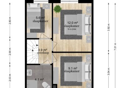 Overloop met toegang tot 3 slaapkamers van 12 m², 9,1 m² en 5,6 m². De volledig betegelde badkamer is voorzien van een douchecabine, wastafel, 2e toilet en een nieuw badkamerraam van kunststof..