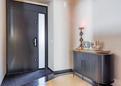 Afgesloten portiek met brievenbussen, gaderobe nis, trappenhuis en lift van het appartementencomplex.