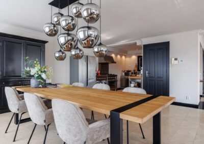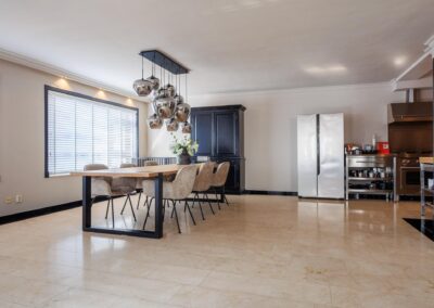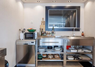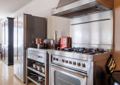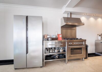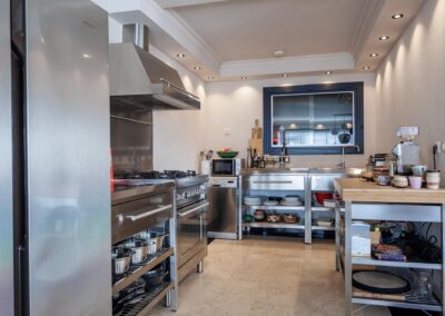 De open keuken is voorzien van diverse apparatuur, waaronder een 6-pits gasfornuis, oven, koel-vriescombinatie en vaatwasser.