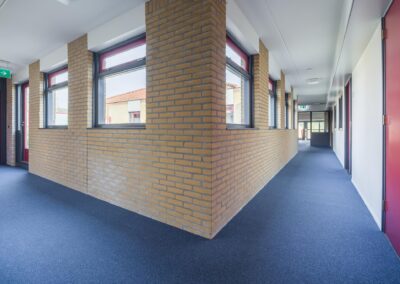 Gelegen op de eerste woonlaag, centrale hal met toegangsdeuren van de appartementen en zicht op het binnenterrein.