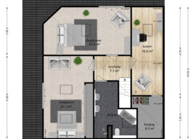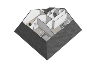 Een vaste trap leidt naar de tweede verdieping, voorzien van 3 slaapkamers en een ruime badkamer, compleet met bubbelbad, douche, dubbele wastafel en een apart toilet. De ruimtes zijn voorzien van dakramen en er zijn volop mogelijkheden om extra slaapkamers te creëren, geheel naar eigen wens.