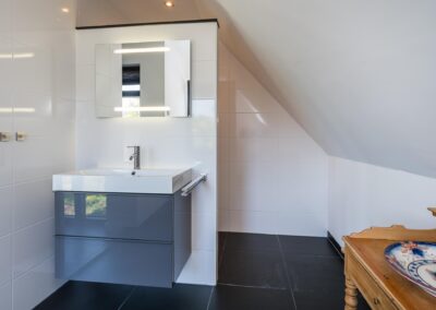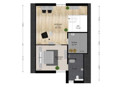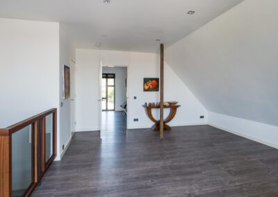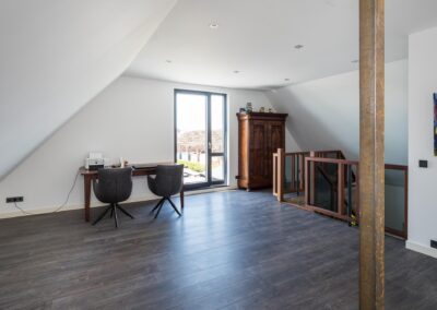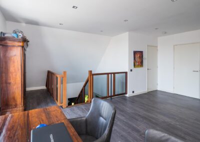 Middels de trap in de hal bereikt u de eerste verdieping. Op de eerste verdieping heeft u vanaf de gehele overloop met glazen balustrade zicht op de hal, voor weer dat ruimtelijk gevoel. Open ruimte/ werkkamer van 25,3 m2, die eventueel geschikt is voor het maken van meerdere slaapkamers, met veel lichtinval en een balkondeur vanwaar er uitzicht is over de tuin en Leersum en een praktische technische ruimte. Voorts is er de toegang tot de royale slaapkamer van 14,6 m2 en en de tweede en-suite badkamer die is uitgerust met een inloopdouche, wastafel en toilet. De gehele verdieping is voorzien van vloerverwarming.