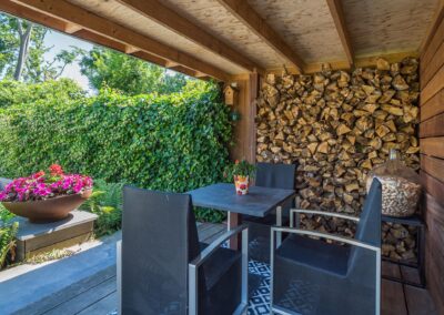 Op het perceel achter in de tuin treft u de luxe veranda met berging en de vijverpomp-installatie.