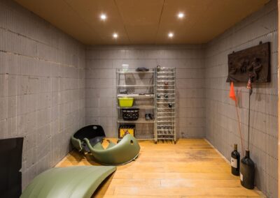 De gehele woning is onderkelderd met een souterrain voorzien van vloerverwarming. De parkeergarage van 99,5 m2 heeft aan de voorzijde een elektrisch bedienbare garagedeur en een verwarmbare oprijlaan. Voorts biedt het souterrain plaats aan een portaal, voorraad-/ wijnkelder, technische ruimtes, toiletruimte en een berging.