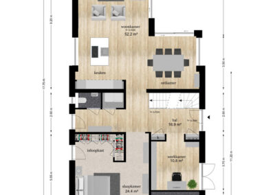 Via de entree betreedt u de woning naar de hal met het trappenhuis, meterkast en de garderobekast. Vanuit de hal loopt u links naar de werkkamer of rechtdoor waar u rechts het toilet en een bijkeuken/wasmachineruimte treft. Verder zijn alle ruimtes in een open verbinding met elkaar verbonden vanuit het centrale punt midden in het huis met doorkijk door de gehele woning.