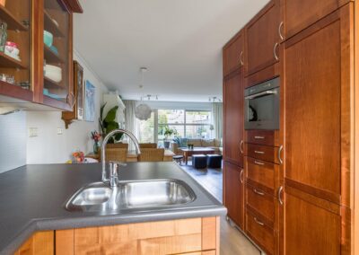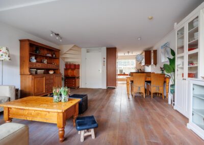 ENTREE met trapopgang naar de eerste verdieping en een meterkast. Via de hal toegang tot de royale, tuingerichte woonkamer met grote raampartij en mooi zicht op de tuin. De woonkamer staat in open verbinding met de keuken aan de voorzijde van het huis, gezamenlijk 42,2 m² groot. Een prettige open keukenopstelling wat gezelligheid biedt en praktisch is bij gebruik tijdens het koken en tafelen. De inbouwkeuken is ingericht met inductieplaat, combi-oven/magnetron, koelkast en vaatwasser.