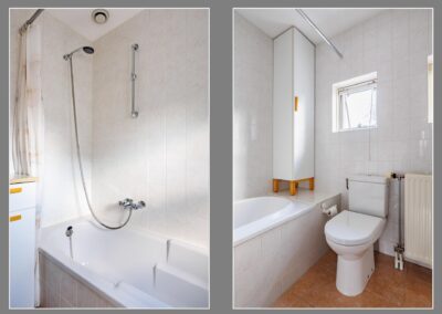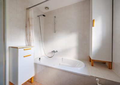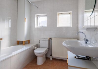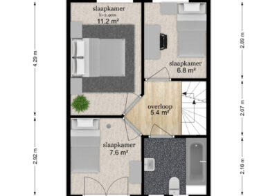 Overloop met 3 slaapkamers en de badkamer. Alle 3 de slaapkamers zijn ruim te noemen en hebben de volgende maten: 11.2 m², 7.6 m² en 6.8m². De badkamer is ingericht met een douche-bad, 2e toilet en een wastafel.