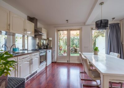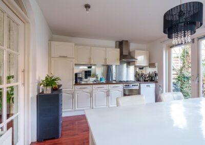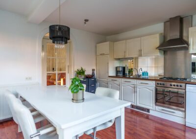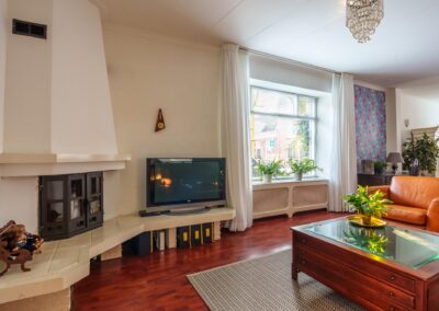 ENTREE, hal met toiletruimte. De royale woonkamer heeft een fraaie lichtinval door de grote raampartij aan voor- en zijkant van het huis. De ruimte is maar liefst 45 m² groot en ingericht met gezellige houtkachel en laminaatvloer. Vanuit de woonkamer is een 2e hal met trap naar de verdieping. In de trapkast bevindt zich de meterkast. Vanuit de woonkamer is de verbinding met de woonkeuken, gecreëerd in de uitbouw, aan de achterzijde van het huis. Deze ruime leefkeuken biedt goede ruimte voor een eettafel en het is een fijne plek voor de rust, met zicht op de stadstuin. De keuken is voorzien van diverse inbouwapparatuur en in de vaste kasten bevindt zich een c.v.-opstelling en zijn er aansluitingen voor eventuele wasmachine en/of droger. Middels de loopdeur of de dubbele tuindeuren is de tuin te bereiken.