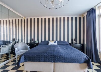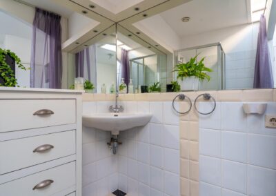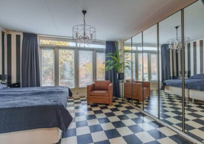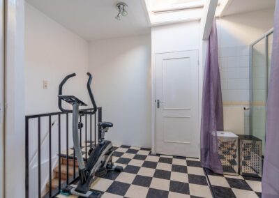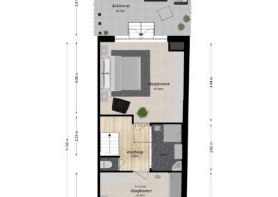 Ruime overloop met dakkoepel en een open verbinding met de badkamer. De badkamer is ingericht met douchecabine en wastafel. Separaat is er een 2e toiletruimte aanwezig. Vanaf de overloop is er toegang tot de grote slaapkamer aan de voorzijde van de woning van 19,4 m². Aan de achterzijde is de hoofdslaapkamer van 20,3 m² met een deur naar het platte dak/-terras.