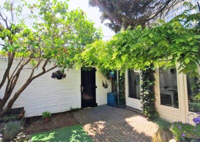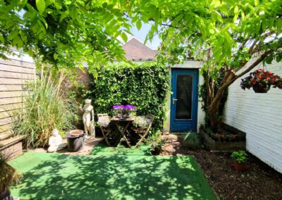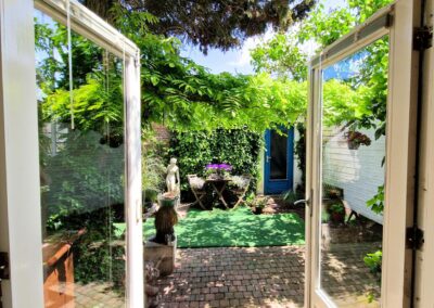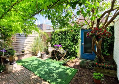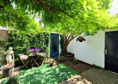 De ommuurde tuin is circa 30 m² met goed terras, afsluitbare poort naar de straat.