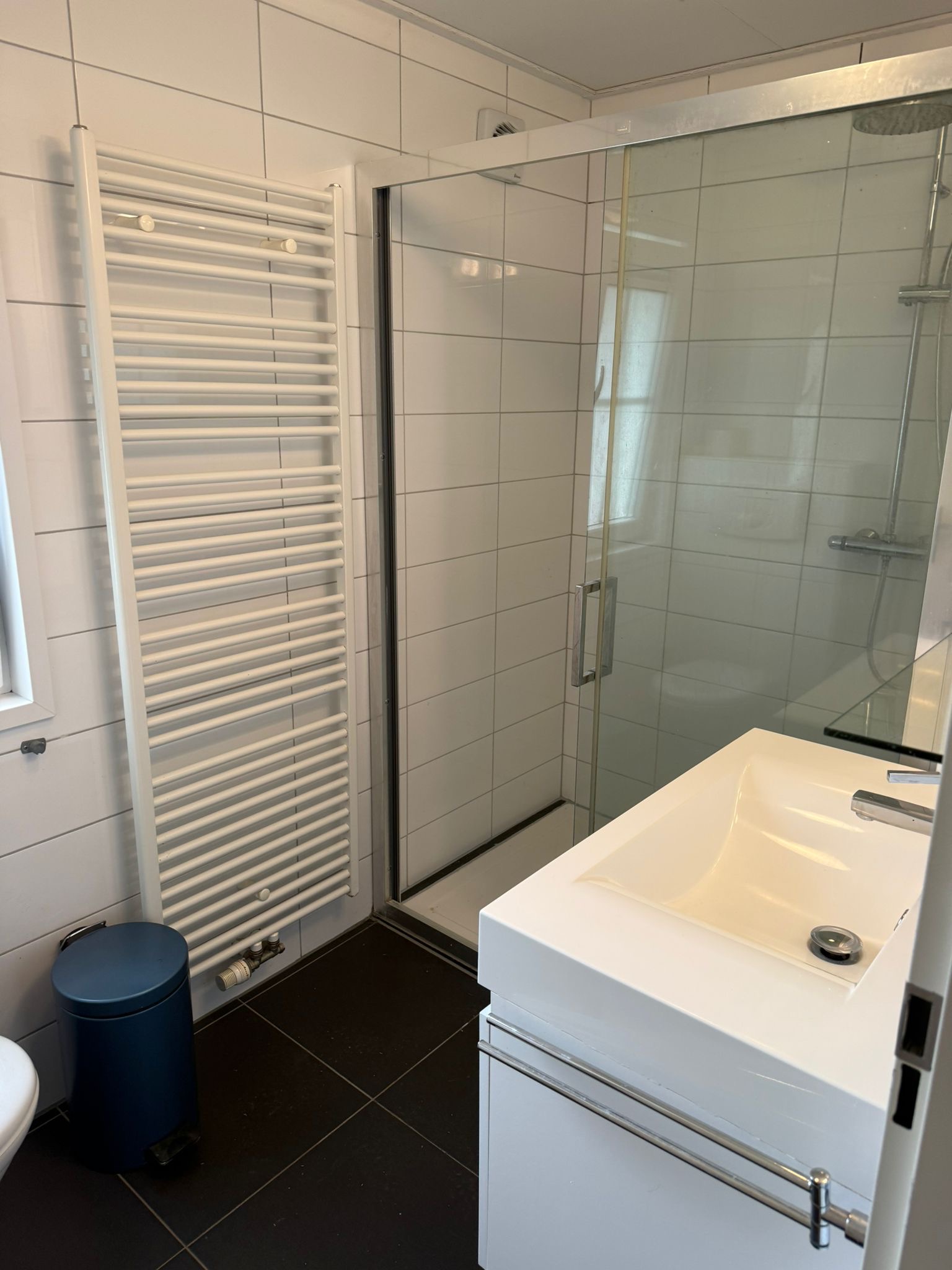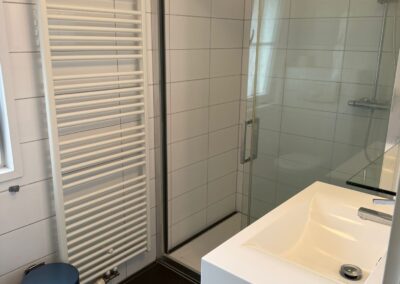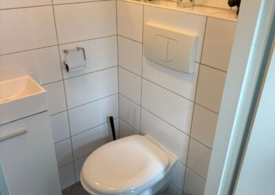 De badkamer (ca. 4,4 m²) is voorzien van een douche, wastafel en toilet. Daarnaast is er nog een aparte bergruimte/technische ruimte aanwezig, ideaal voor extra opslag.