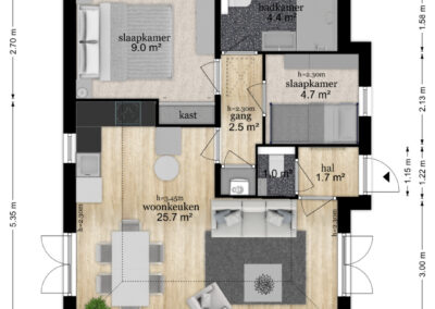 Via de gang toegang tot 2 slaapkamers (respectievelijk 9,0 m² en 4,7 m²) en een badkamer met wastafelmeubel, toilet en douche.