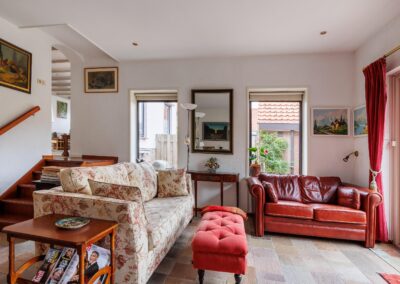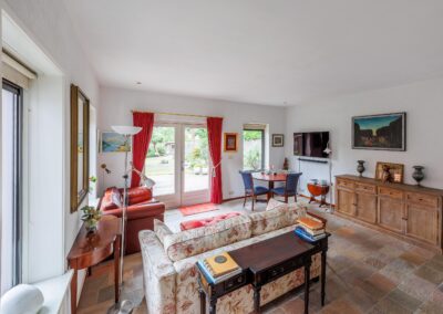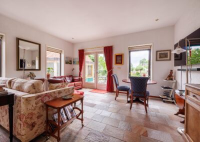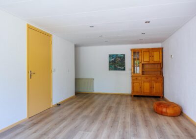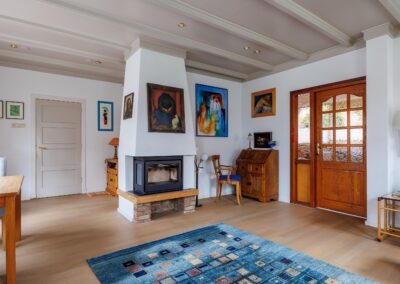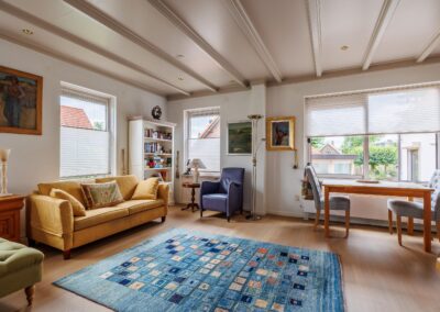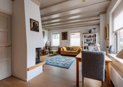 Wanneer u de woonkamer betreedt vanuit de ruime hal, valt meteen het overvloedige daglicht op dat binnenstroomt via de vele raampartijen. De royale woonkamer ademt warmte en gezelligheid, mede dankzij het sfeervolle balkenplafond en de houtkachel. De vloer in de hal, woonkamer en keuken zijn voorzien van een massieve, Franse, eikenhouten vloer. Via een speelse trap komt u in de tweede woonkamer, ook wel de tuinkamer, vanwege het prachtige groene uitzicht. Deze ruimte is voorzien van openslaande deuren en vloerverwarming.